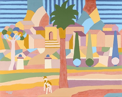 Representados por la mezcla de colores planos, pero llenos de degradados que es el efecto, consiguiendo cuando se juntan la pintura acrílica con la pintura de cal, que se estampan sobre el lienzo, quedando un color cielo, y de color seco, árboles, las cenéfas, los siurells... todo un mundo mediterráneo.