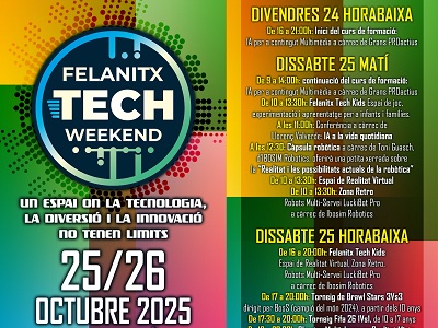 La Felanitx Tech Weekend torna amb una nova edició plena de videojocs, intel·ligència artificial i tecnologia per a totes les edats. L’edició d’enguany se celebrarà el 25 i 26 d’octubre. La Felanitx Tech Weekend celebra una nova edició amb una proposta renovada i tres grans eixos temàtics que convertiran Felanitx en el centre tecnològic de Mallorca durant tot un cap de setmana. L’esdeveniment combinarà oci digital, formació en noves tecnologies i activitats educatives per a infants i famílies, oferint un espai únic d’experiències per a tots els públics.